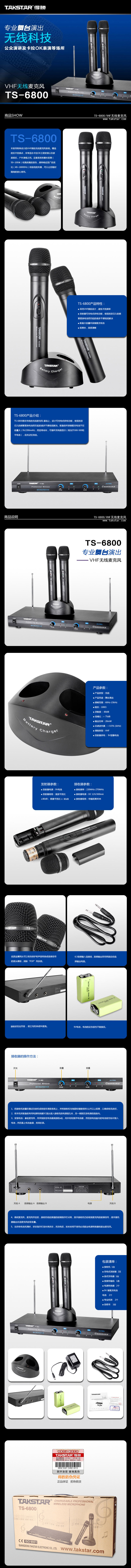 • 纸盒包装 • 接收机 1台 • 充电式发射器 2支 • 座式充电器 1台 • 音频传输线 1条 • 电源转换器AC 220V: DC 12V 300mA 2个 • 说明书 1份 • 专业机架 2个 • 6F22/9V镍氢充电池 2个 • 服务卡 1份 • 合格证 1份 |