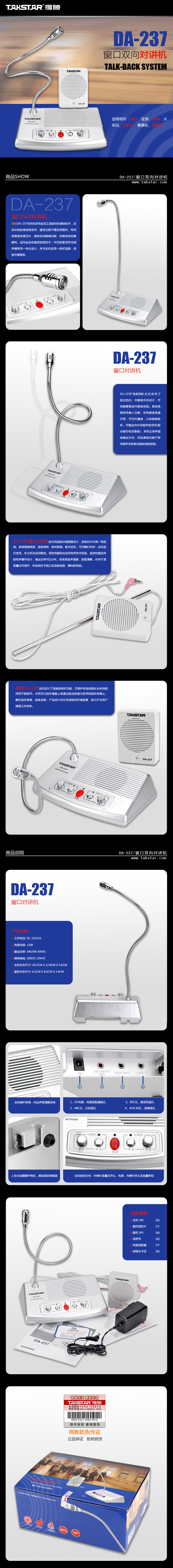 • 工作电压: DC 12V/1A • 电源功耗: ≤5W • 输出功率: 3W/3W (max) • 频率响应: 100Hz-12kHz • 主机外形尺寸: 18.2cm x 12.0cm x 5.6cm • 副机外形尺寸: 6.1cm x 8.5cm x 2.4cm |