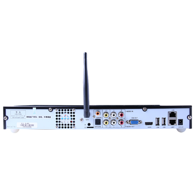 • 视频输出接口:HDMI (1个) 1920*1080、 VGA (1个) 1920*1080,AV (2个) PAL/NTSC • 音频输出接口:左右声道 (一组) 20~20kHz<0.002%、 光纤192kHz/24BIT、同轴192kHz/24BIT • 内置无线网络: 2.4G 802.11b/g/n(含天线) • 外接红外盒接口:1个IR38kHz • 串口: 1个(RJ45输出)