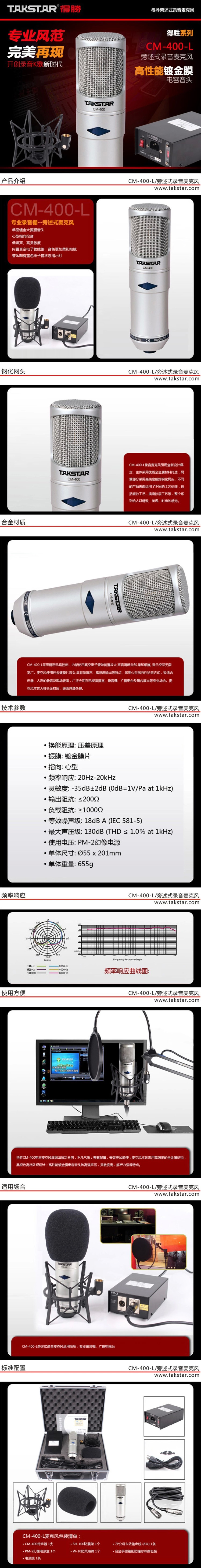 • 换能原理: 压差原理 • 振膜: 镀金膜片 • 指向: 心型 • 频率响应: 20Hz-20kHz • 灵敏度: -35dB±2dB (0dB=1V/Pa at 1kHz) • 输出阻抗: ≤200Ω • 负载阻抗: ≥1000Ω • 等效噪声级: 18dB A (IEC 581-5) • 最大声压级: 130dB (THD ≤ 1.0% at 1kHz) • 使用电压: PM-2幻象电源 • 单体尺寸: Ø55 x 201mm • 单体重量: 655g