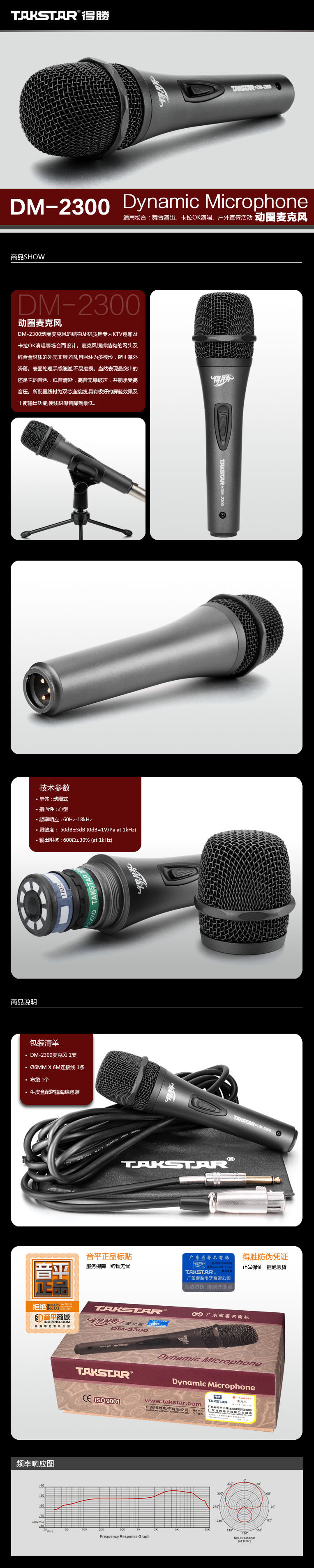• 单体: 动圈式 • 指向性: 心型 • 频率响应: 60Hz-18kHz • 灵敏度: -50dB±3dB (0dB=1V/Pa at 1kHz) • 输出阻抗: 600Ω±30% (at 1kHz)