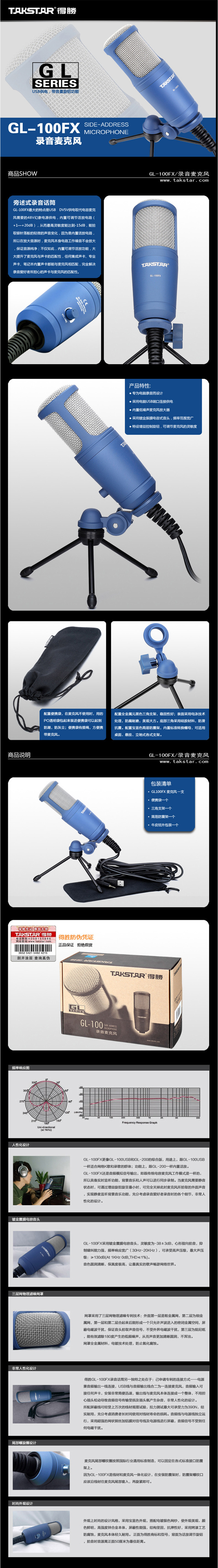 • GL-100FX录音麦克风 1支 • H-200宝蓝色简易支架 1个 • 全金属元黑色三角支架 1个 • 便携袋 1个 • 说明书 1份