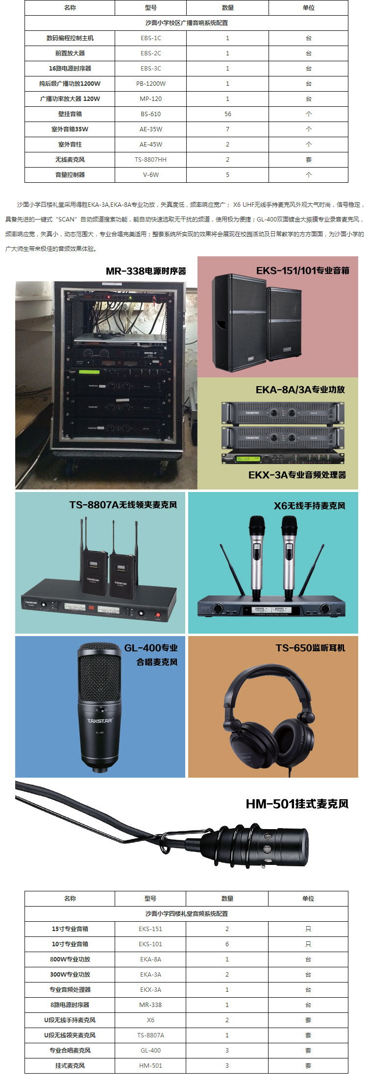 沙面小学校园广播系统配置得胜EBS-3C 16路电源时序器,能有效确保整套用电系统和设备的安全与稳定;TS-8807HH UHF无线手持麦克风采用先进自动对频技术,抗干扰能力超强,高档液晶显示,工作状态直观明了;AE-35W、AE-45W室外音箱、56台BS-610专业音箱效率高、稳定性好,声音通透亮丽;整套设备采用强大组合设计,专为广播系统打造,为全体师生创造了一个健康、和谐的视听环境。